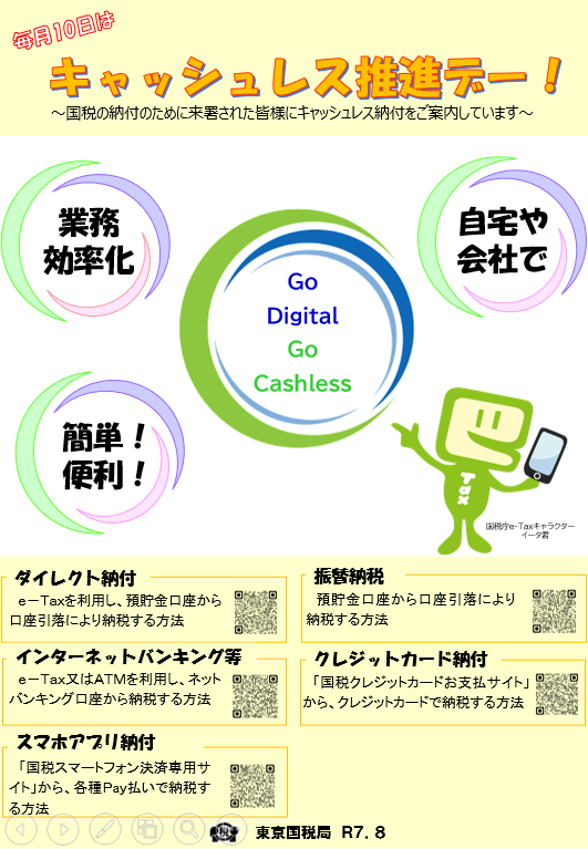 - お知らせ 毎月10日は、本郷税務署「キャッシュレス推進デー」です。税務署窓口で職員に補助してもらいながら、納税者御自身のスマートフォンなどを利用してキャッシュレス納付のお手続きを行っていただくことができます。