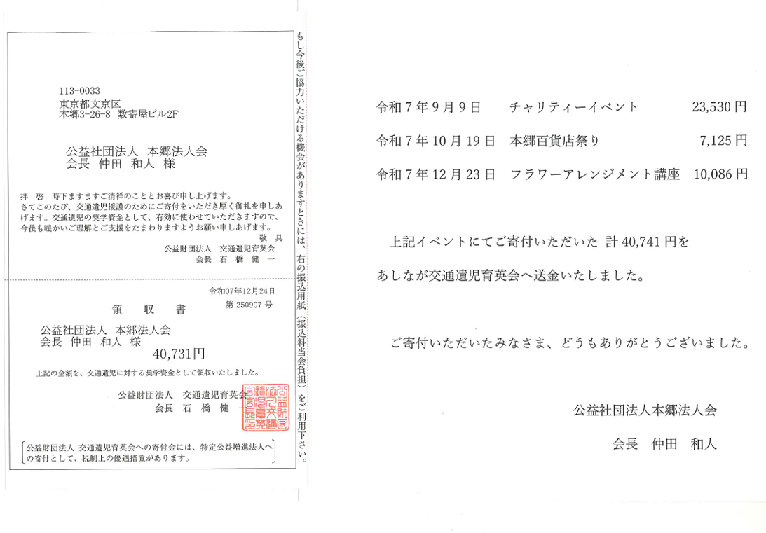 皆様からのご寄付をあしなが交通遺児育英会に送金いたしました。