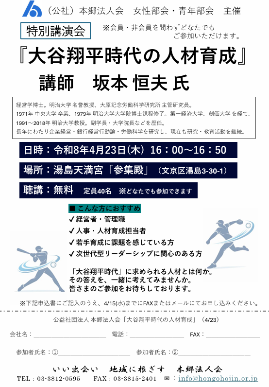 <女性部会・青年部会主催 >特別講演会『大谷翔平時代の人材育成』【どなたでも参加いただけます】